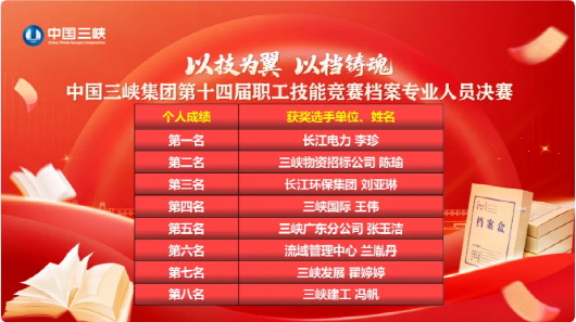 本網(wǎng)訊(吳茜)7月4日,集團公司第十四屆職工技能競賽檔案專業(yè)人員決賽在湖北武漢圓滿落幕,長江環(huán)保集團參賽選手憑借扎實的專業(yè)技能和精彩的現(xiàn)場表現(xiàn),在競賽中脫穎而出。其中,安徽區(qū)域公司劉亞琳獲得競賽個人第三名,并將被授予“中國三峽集團技術能手”“中國三峽集團青年崗位能手”稱號;江西區(qū)域公司湯玉玉和安徽區(qū)域公司劉亞琳所在參賽隊伍,在“請聽檔案說”團體競賽環(huán)節(jié)排名第一,獲得“最佳展示獎”。